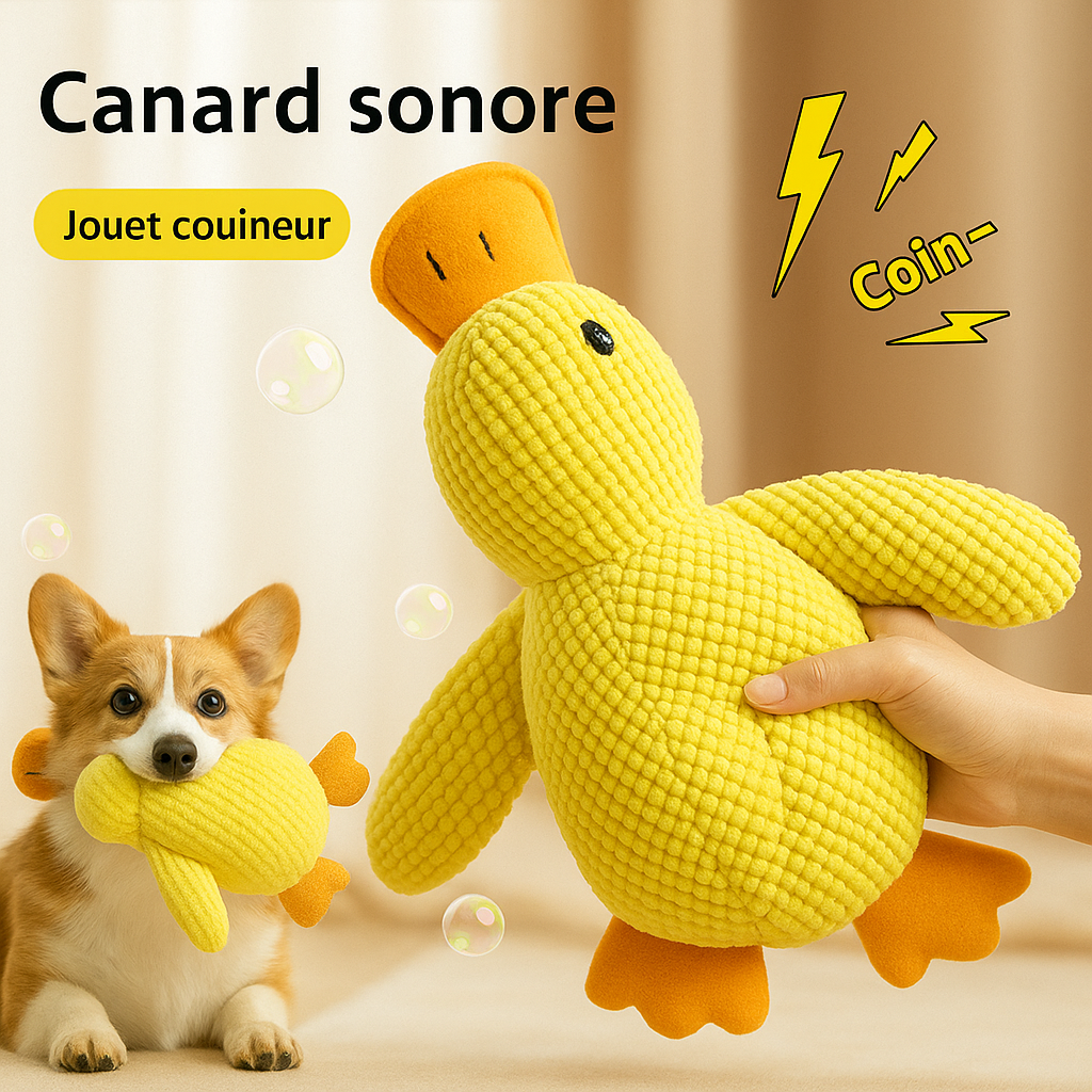 Il émet un petit "coin-coin" grave qui stimule l’instinct de jeu chez les chiens — sans être aussi strident qu’un couineur classique.